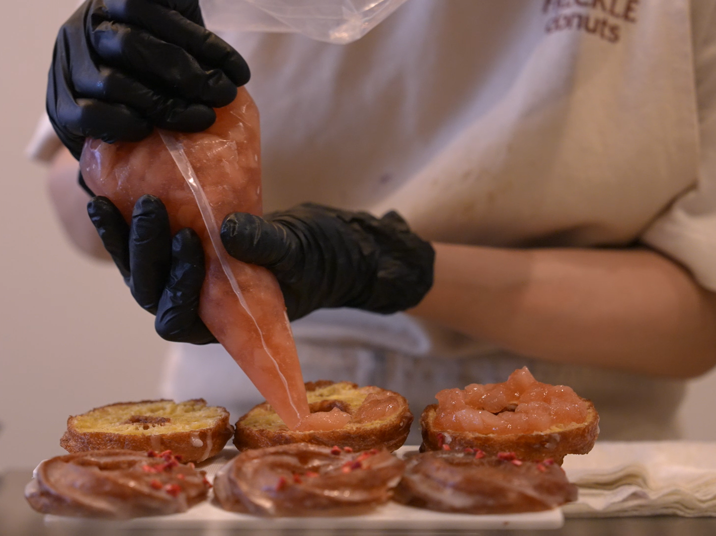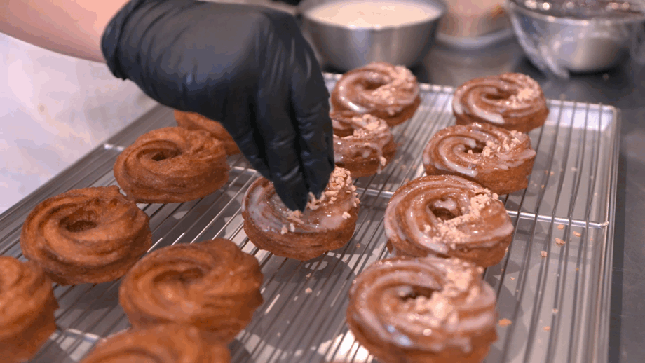 「他のドーナツと差をつけるならパティシエとして何ができるかを考えたときに、フレンチクルーラーが思い浮かびました」と西山さんは振り返る。軽やかで口どけのよいシュー生地なら、これまで培ってきた技を最大限に活かせると感じたという。