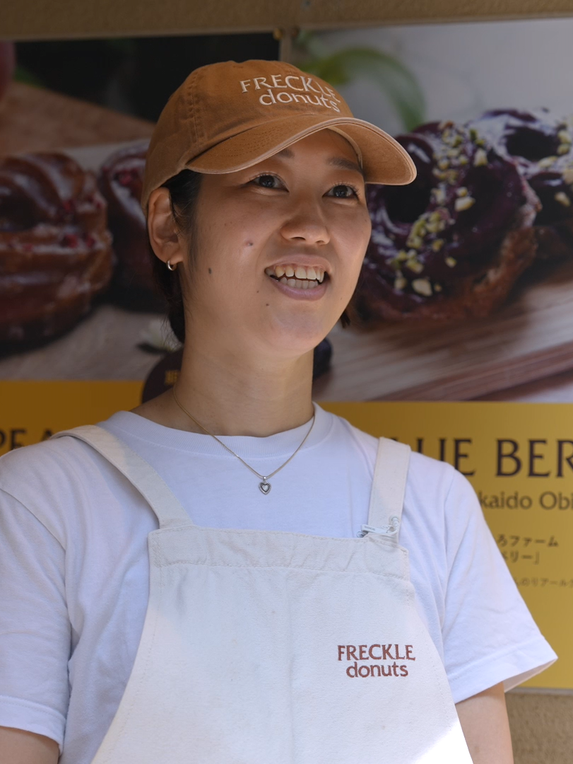 子どものころから好きだったお菓子の道へ進むべく、短大で語学を学んだ後に専門学校で製菓を専攻。都内パティスリーやレストラン、カフェで経験を積み、飲食店を運営する株式会社Rootへ入社。同社が展開するビストロで、パティシエとして国産の果実や食材を活かしたデザートメニュー監修・開発を担当する。FRECKLE donutsの立ち上げ当初から携わり、素材選びから味のバランスまで徹底的に吟味し、唯一無二の味わいを生み出した。産地や農家を直接訪ね、生産者と対話を重ねながら、より美味しいドーナツ作りに日々情熱を注いでいる。