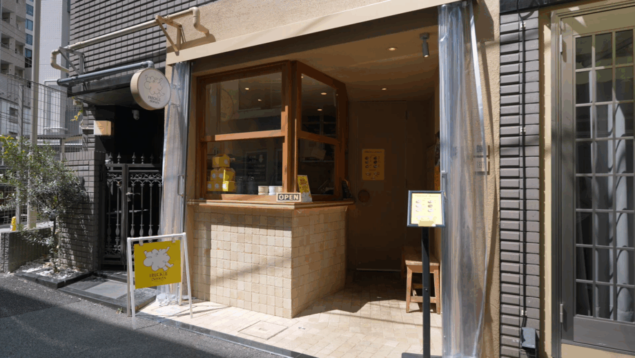 代々木公園のほど近く、静かな裏路地に黄色い看板が目を引く小さなショップ。次々と人が立ち寄り、窓口でメニューを見ながらドーナツを選ぶ光景が日常の一コマに溶け込んでいる。