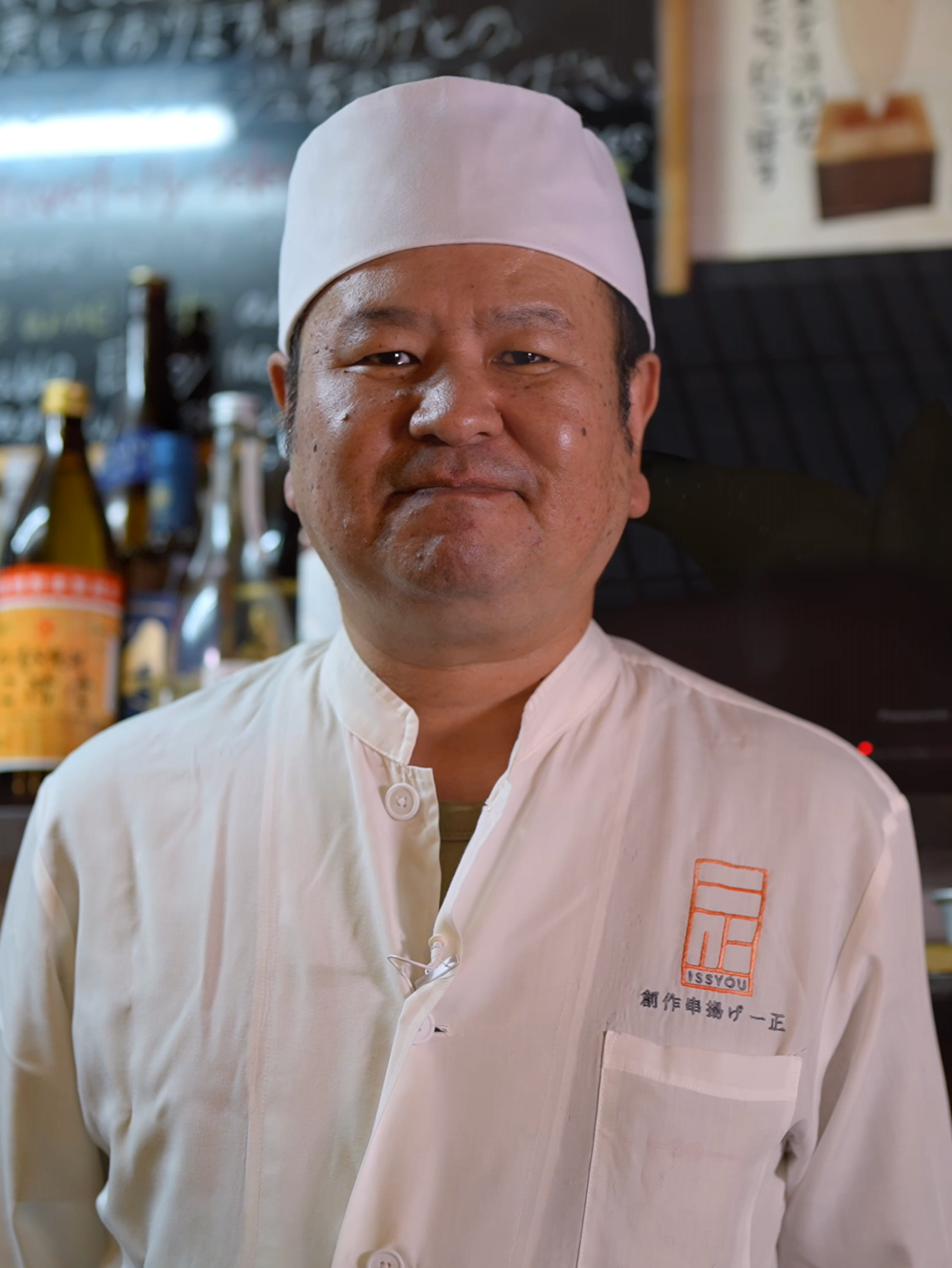 サラリーマンを経験後、知人の誘いをきっかけに料理の道へ。薬膳ラーメンから和食・中華・洋食まで、多ジャンルで腕を磨き、二度の独立を経験する。しかし若さゆえの未熟さから閉店も経験した。40代を目前に地元・大正で三度目の挑戦を決意し、2016年、1串ずつ提供するコース仕立ての創作和食串揚げの店「一正」をオープン。和食をベースに多彩なジャンルの技法と知識を融合させた独自の串揚げは、その斬新な味わいから女性客や外国人にも高く支持されている。毎朝、木津市場で厳選した素材を仕入れることから一日が始まり、休日も食への探究を欠かさない。趣味はサウナ巡りで、良い休息の時間となっている。