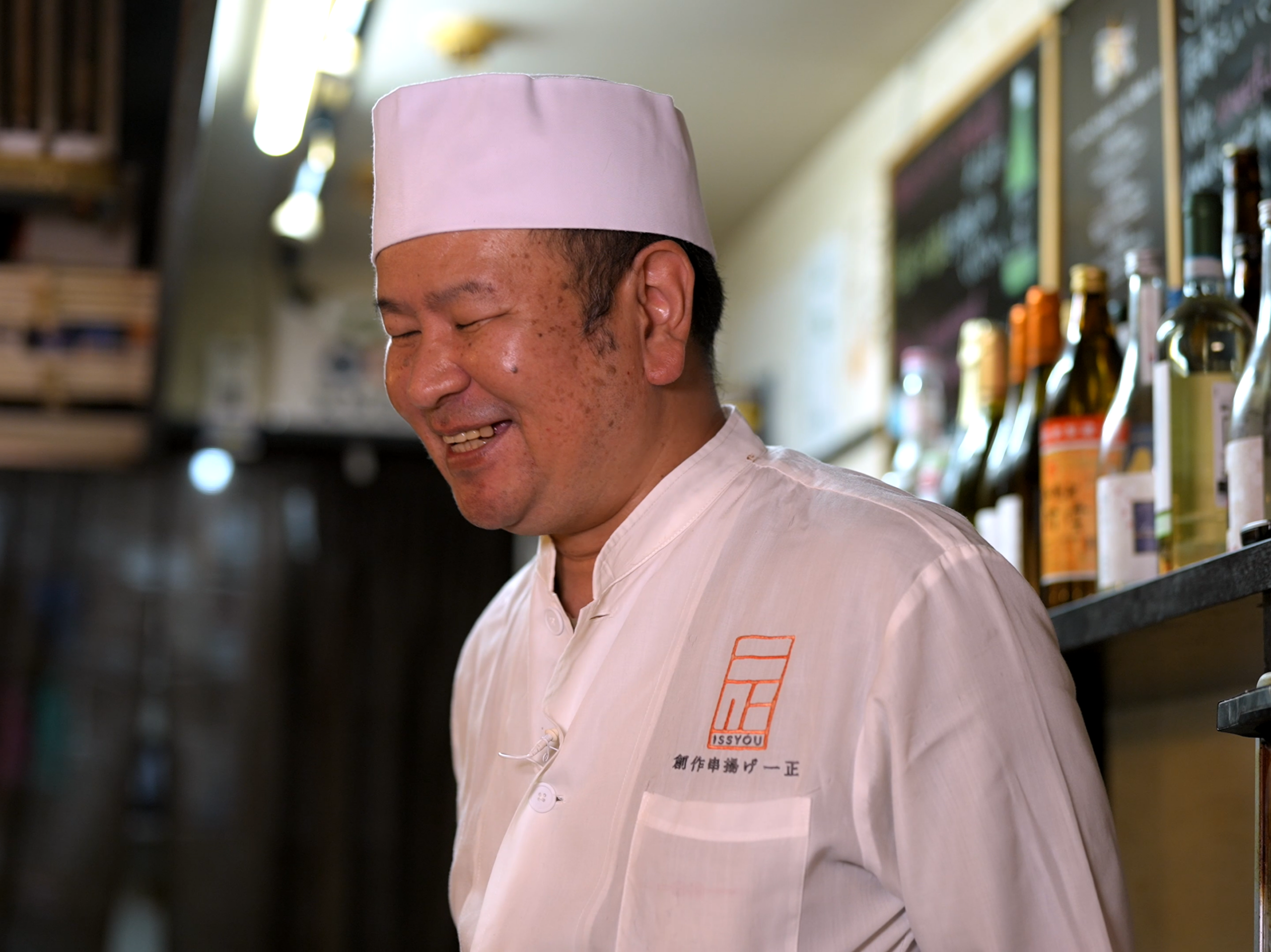 サラリーマンを経験後、知人の誘いをきっかけに料理の道へ。薬膳ラーメンから和食・中華・洋食まで、多ジャンルで腕を磨き、二度の独立を経験する。しかし若さゆえの未熟さから閉店も経験した。40代を目前に地元・大正で三度目の挑戦を決意し、2016年、1串ずつ提供するコース仕立ての創作和食串揚げの店「一正」をオープン。和食をベースに多彩なジャンルの技法と知識を融合させた独自の串揚げは、その斬新な味わいから女性客や外国人にも高く支持されている。毎朝、木津市場で厳選した素材を仕入れることから一日が始まり、休日も食への探究を欠かさない。趣味はサウナ巡りで、良い休息の時間となっている。