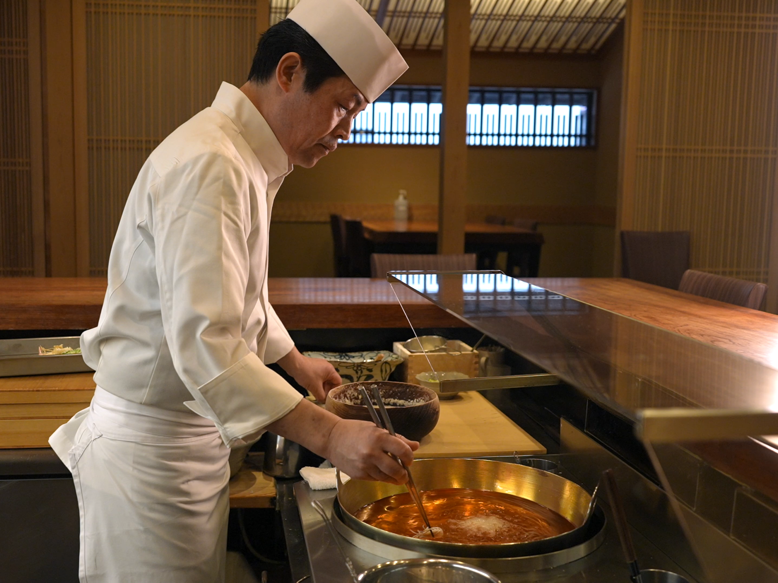 フランス料理では、その店やシェフが得意とする看板料理“スペシャリテ”を持つことが多い。和食では必ずしも一般的ではないが、土阪さんは店を構えるにあたり「コース全体の完成度に加え、記憶に残る “スペシャリテ”となる山場を作りたい」と考えた。それまで客前調理で最も率直な反応が返ってきたのが天ぷらだったことから、「会席の中でも山場を作ることができる」との思いが芽生えたという。